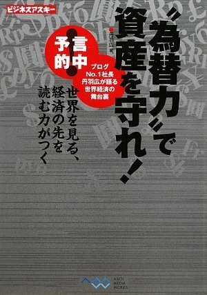 面白い!FX業界では有名人の丹羽広氏の著書 為替力で資産を守れ!丹羽広著。私は、株式投資・外国為替(FX)を運用しているが、FXを運用している人であれば一度は耳にされていると思う。私が、書店で他の目当ての本を探していたところ聞き覚えがある名前だったので購入した。購入して数日後にニュースを見ると、FX業界の規制強化との報道。本のなかで丹羽氏が訴えていたFX業界の規制強化が現実となったのだ。低スプレッド・高レバレッジを宣伝文句にしている会社も長続きしない、これからは信用力の時代との事も書いてありました。